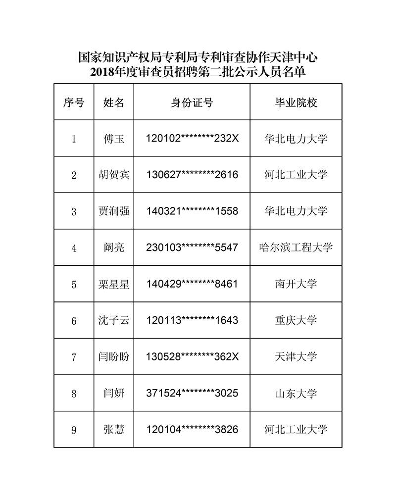 附件:专利审查协作天津中心2018年度审查员招聘第二批公示人员名单